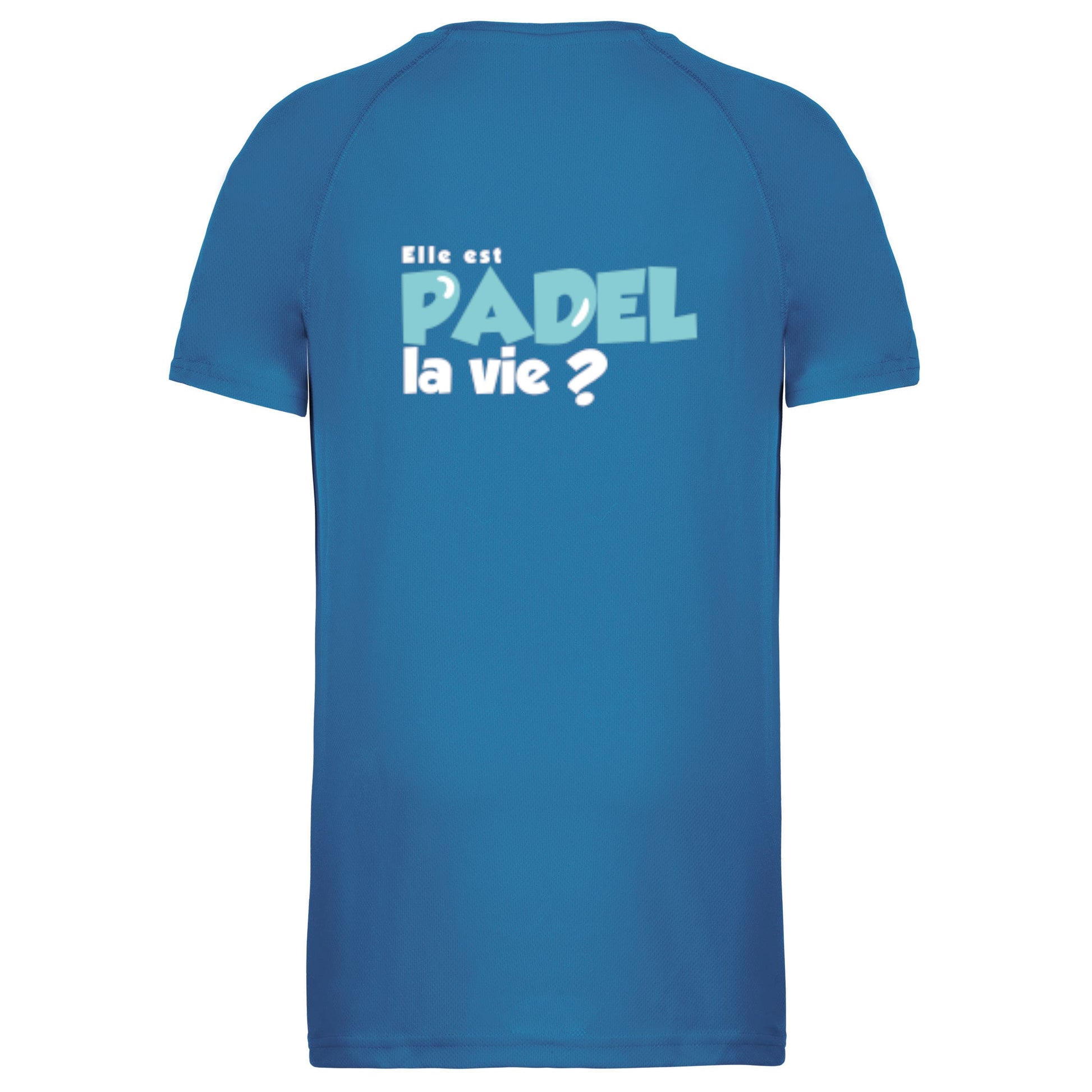 T-shirt technique 100 % polyester, léger et respirant, avec le logo Elle est padel la vie ? côté cœur, pour partager le padel avec style et bonne humeur.