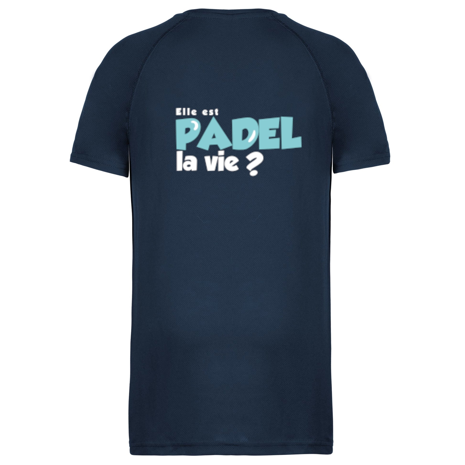 T-shirt technique 100 % polyester, léger et respirant, avec le logo Elle est padel la vie ? côté cœur, pour partager le padel avec style et bonne humeur.