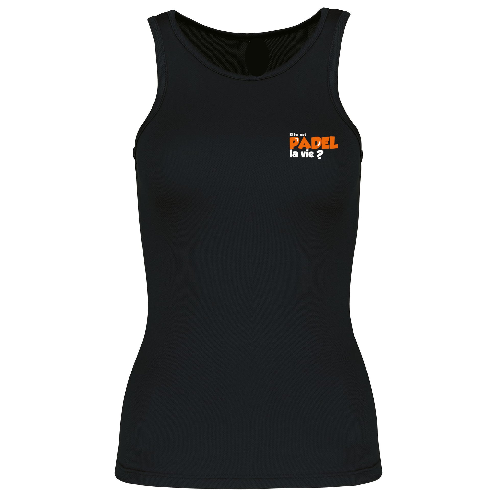 Débardeur technique 100 % polyester, léger et respirant, avec la phrase Elle est padel la vie ? côté cœur, pour partager le padel avec style et bonne humeur.